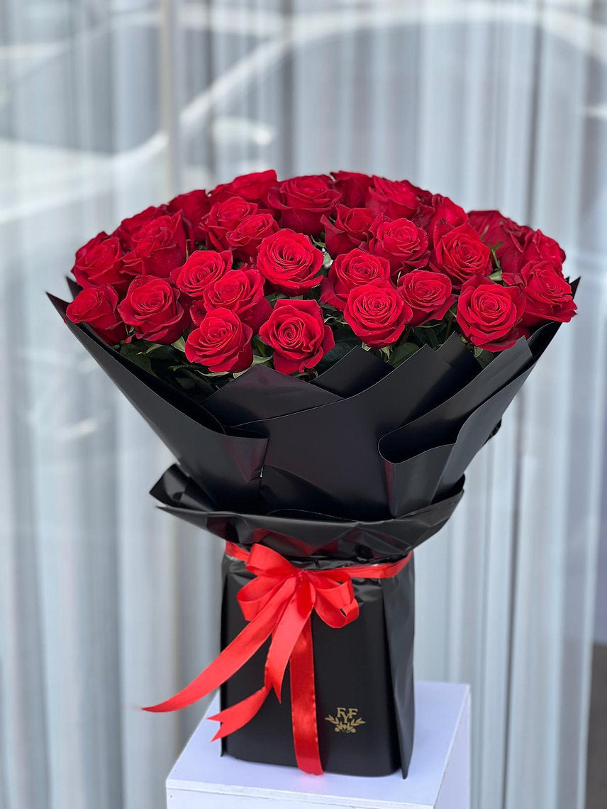 50 pcs of Red Roses - Petals shine in beauty, Standing Bouquet. It comes with a personalized greeting card.