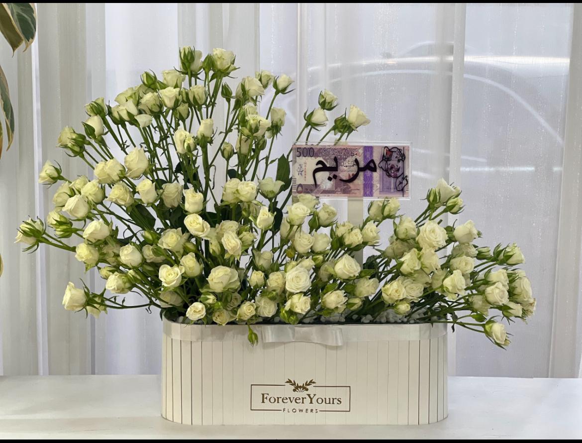 White baby roses arrangement in Oblong box, comes with acrylic money envelope.