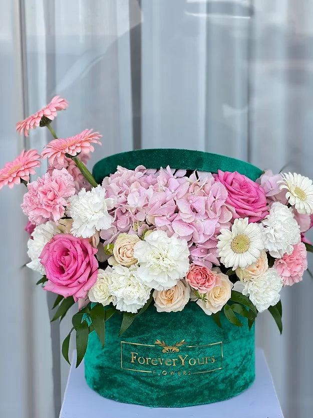 Mixed colors and variety of flowers in Green Velvet Box. It comes along with a greeting card.ย