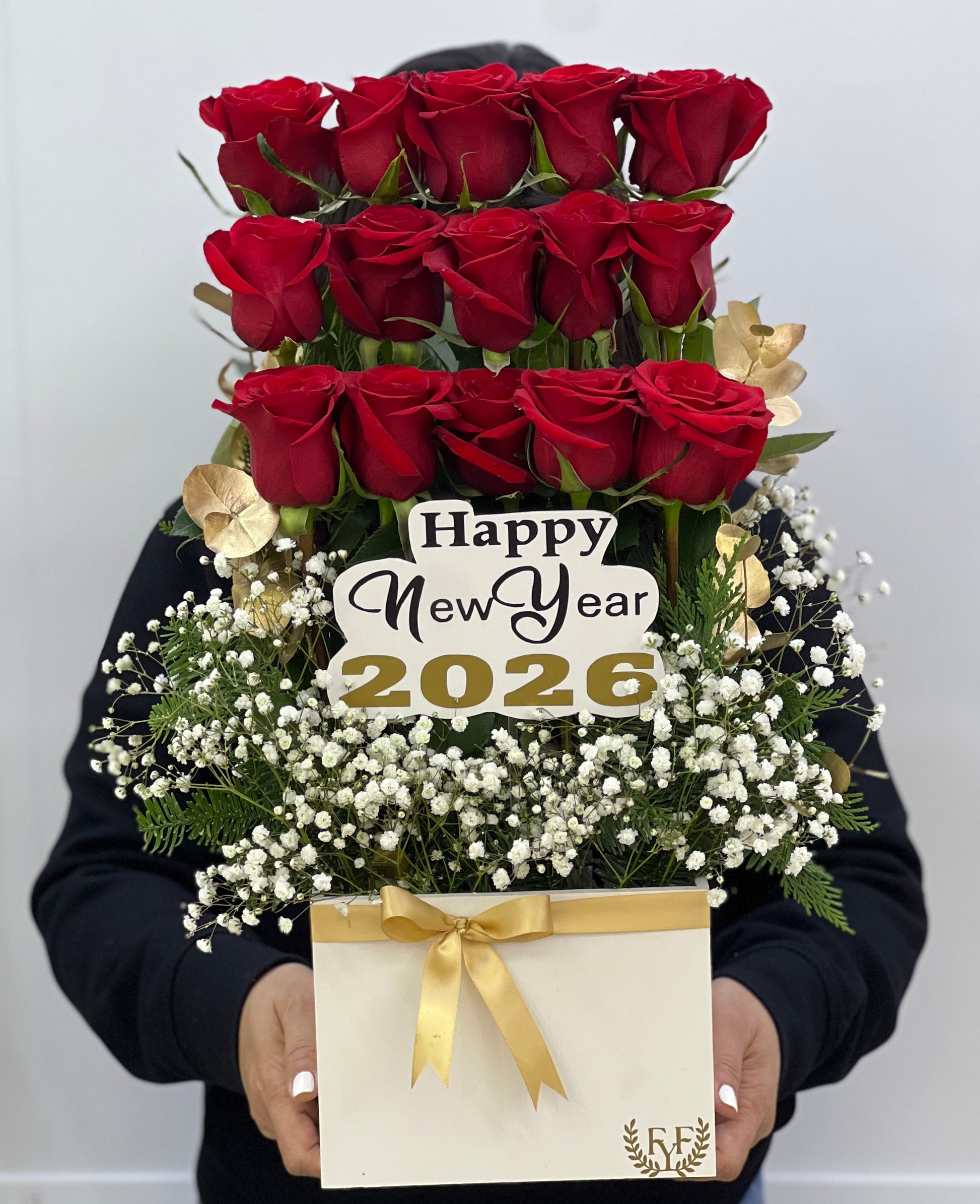 Welcome YEAR2026 With abundance and fresh vibrant color of Red roses, arranged perfectly in forex box with topper.