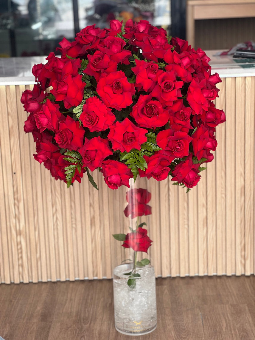 red roses round floral arrangements all red roses in 60cm cylinder vase