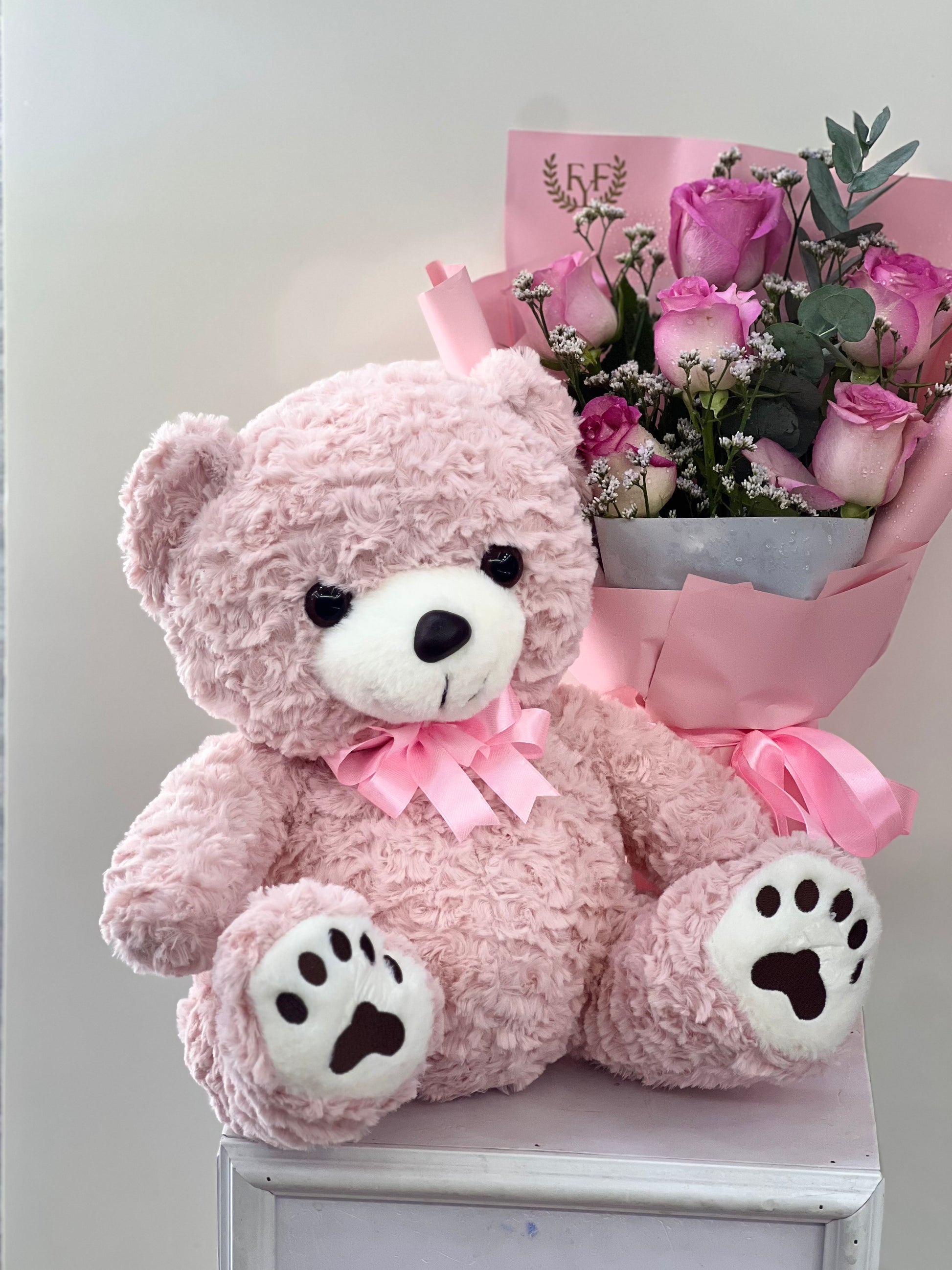 Pink on the move, a bouquet of half Dozen roses and 40cm huggble teddy.