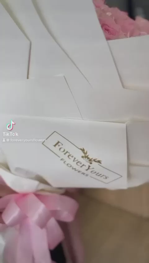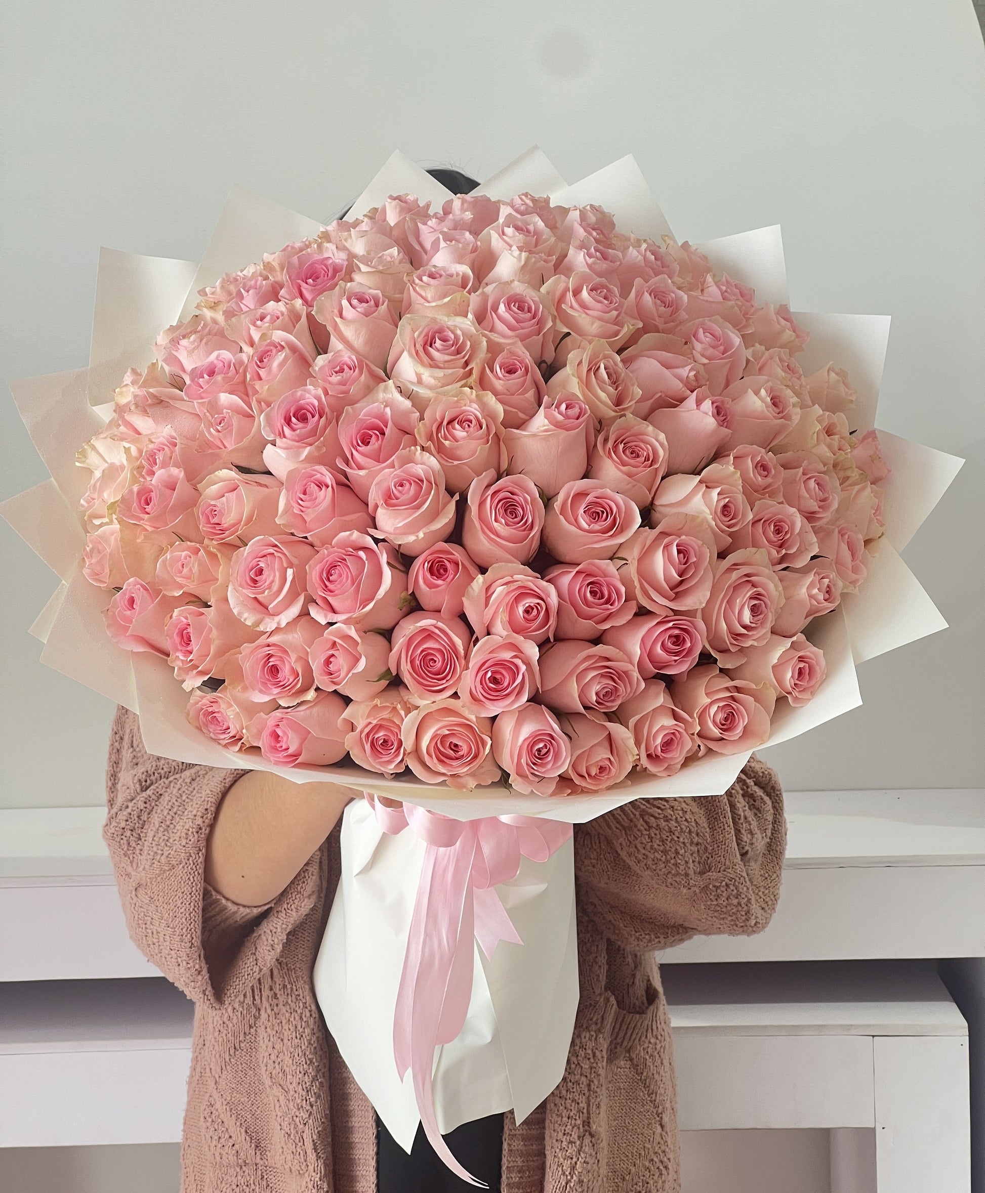 100 pcs pink roses in white wrapping it comes with pink ribbon and personalized greeting card
