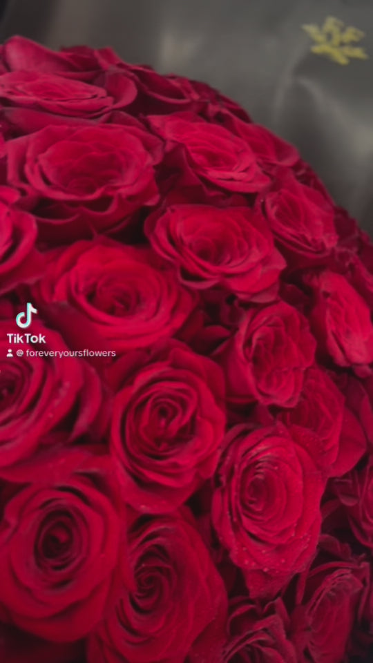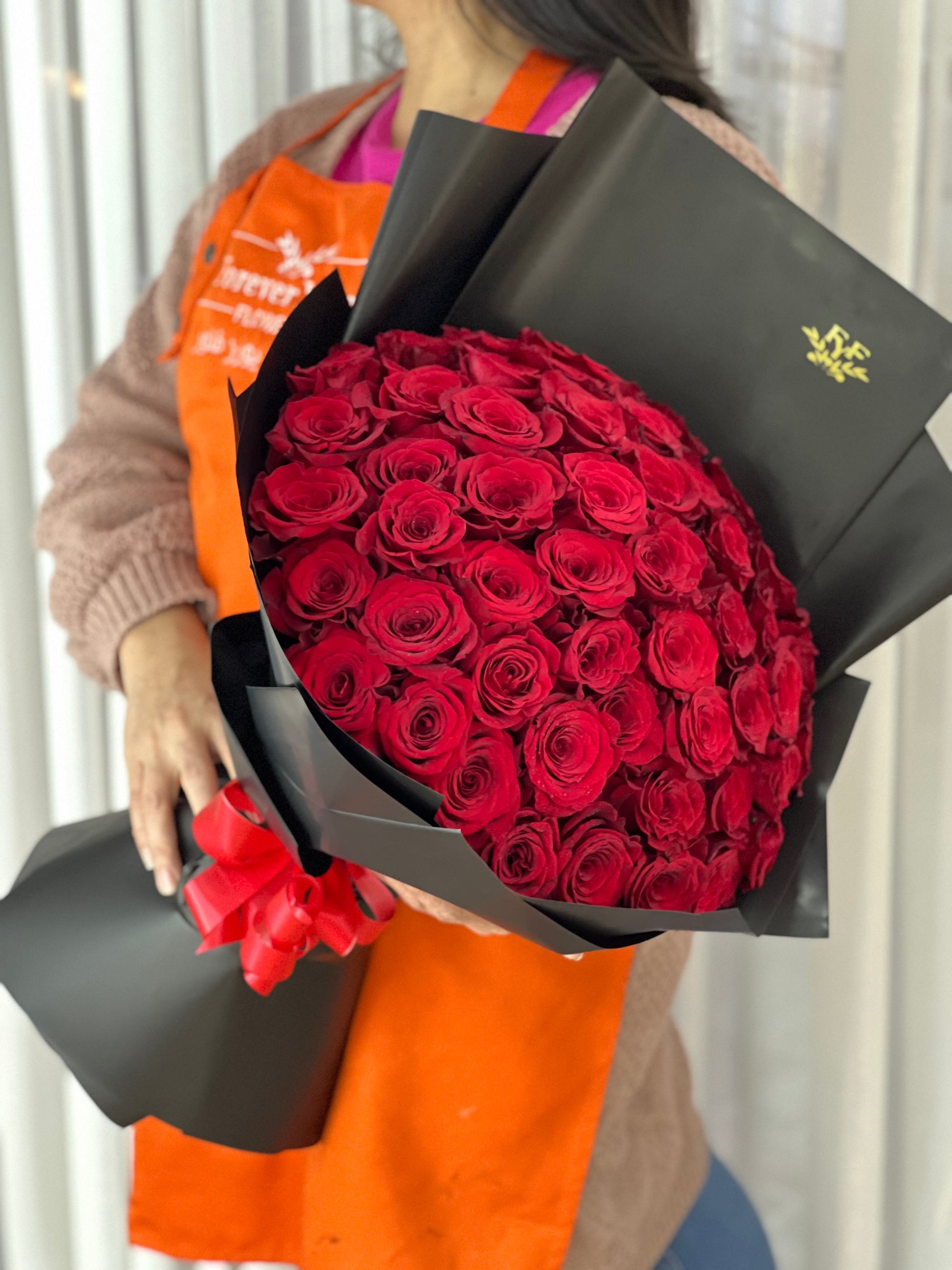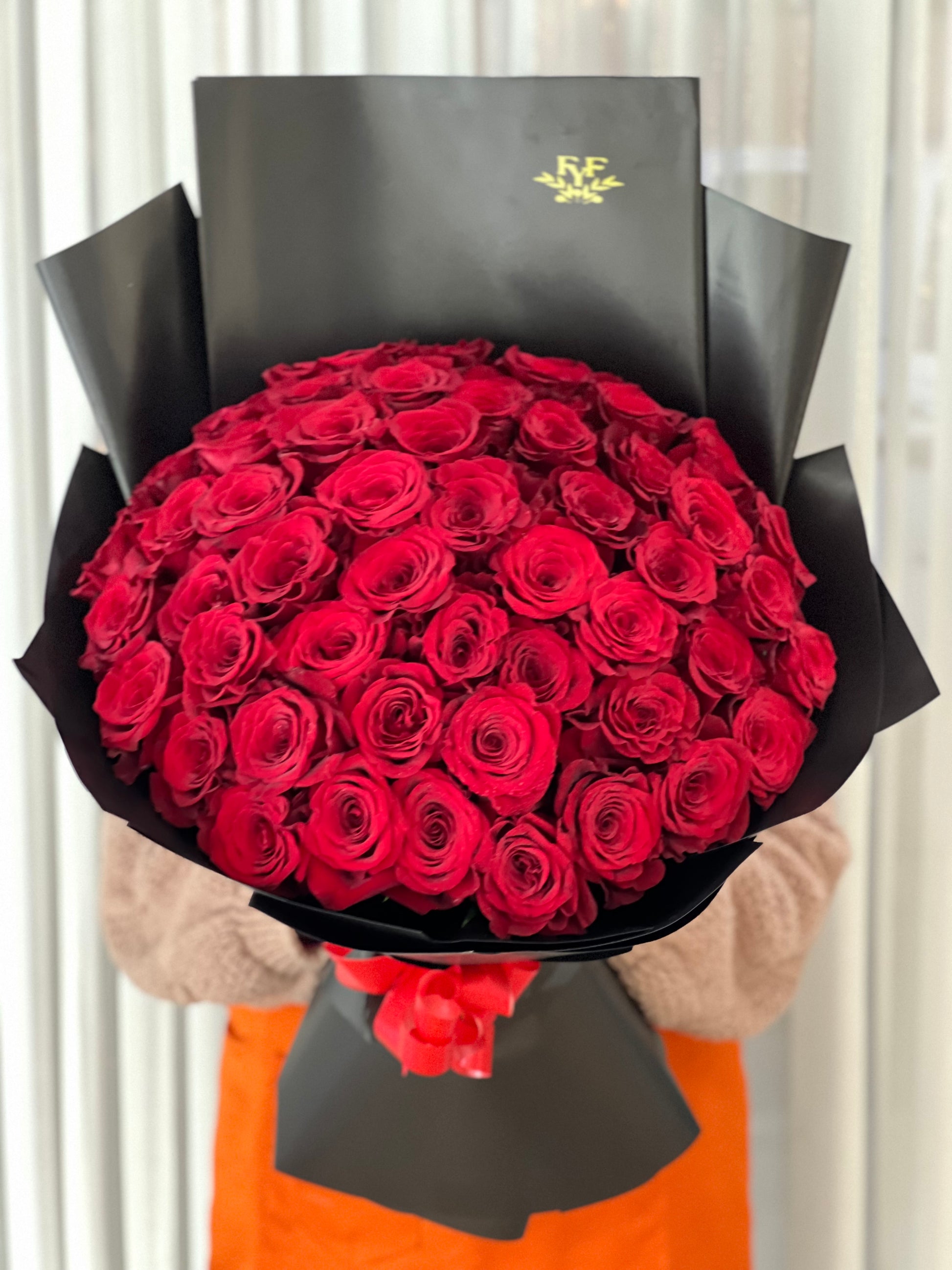 50pcs red roses in black wrapping and comes along with red ribbon.
