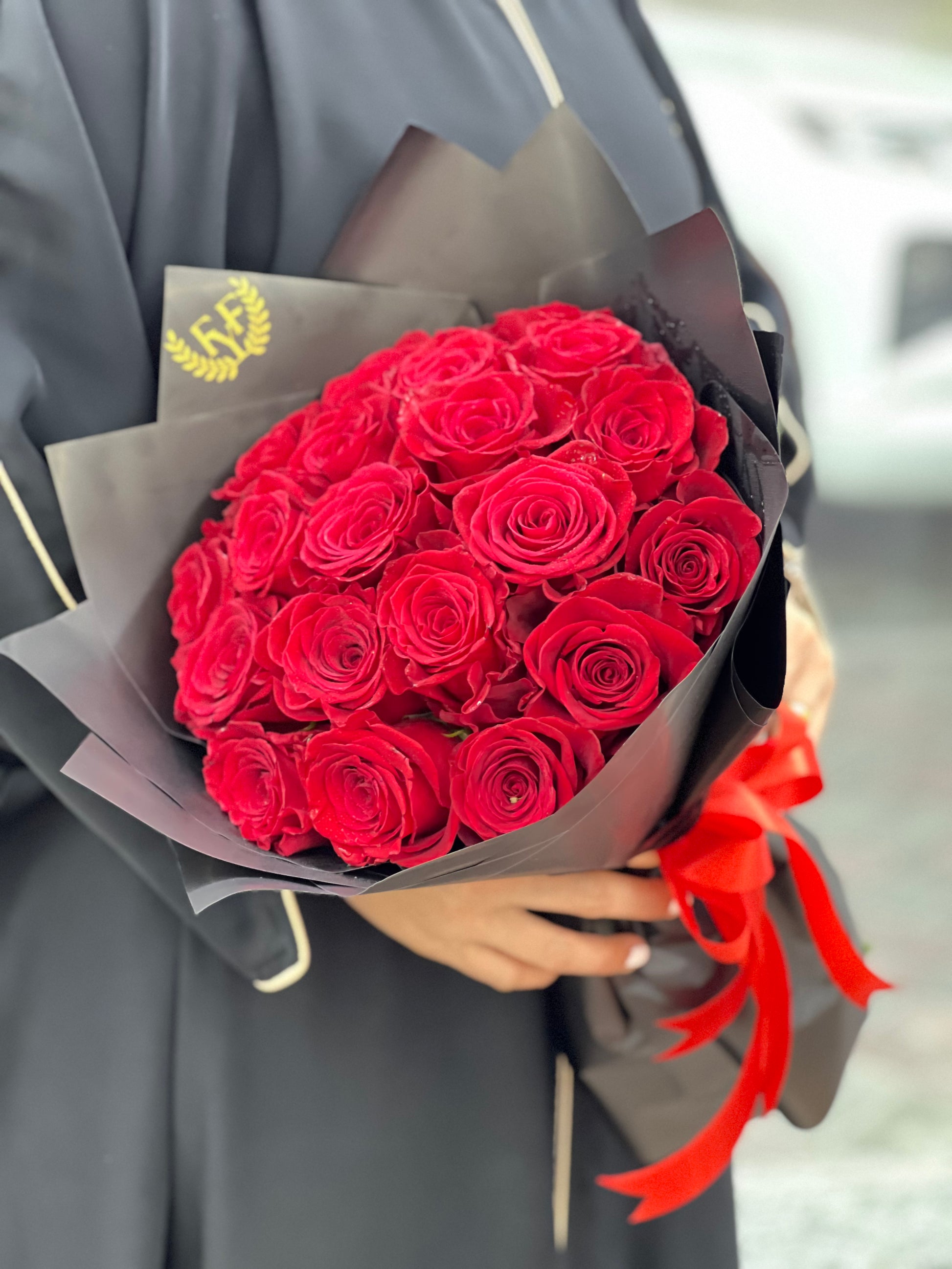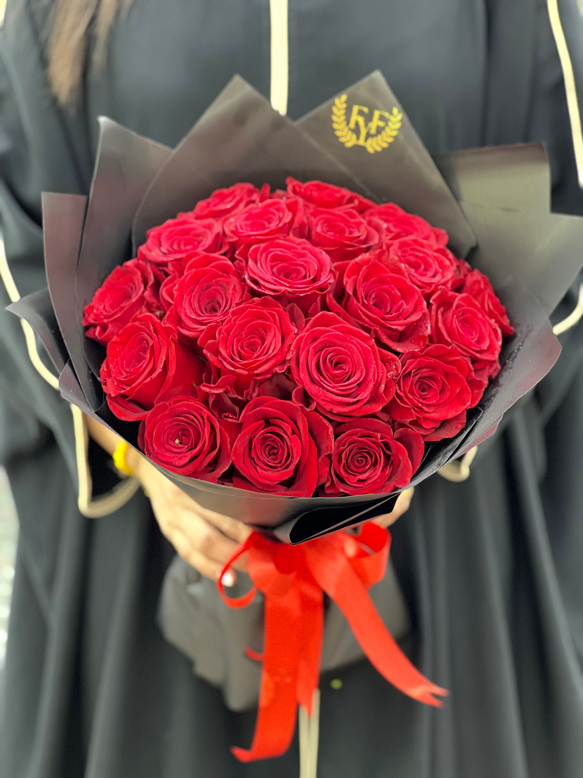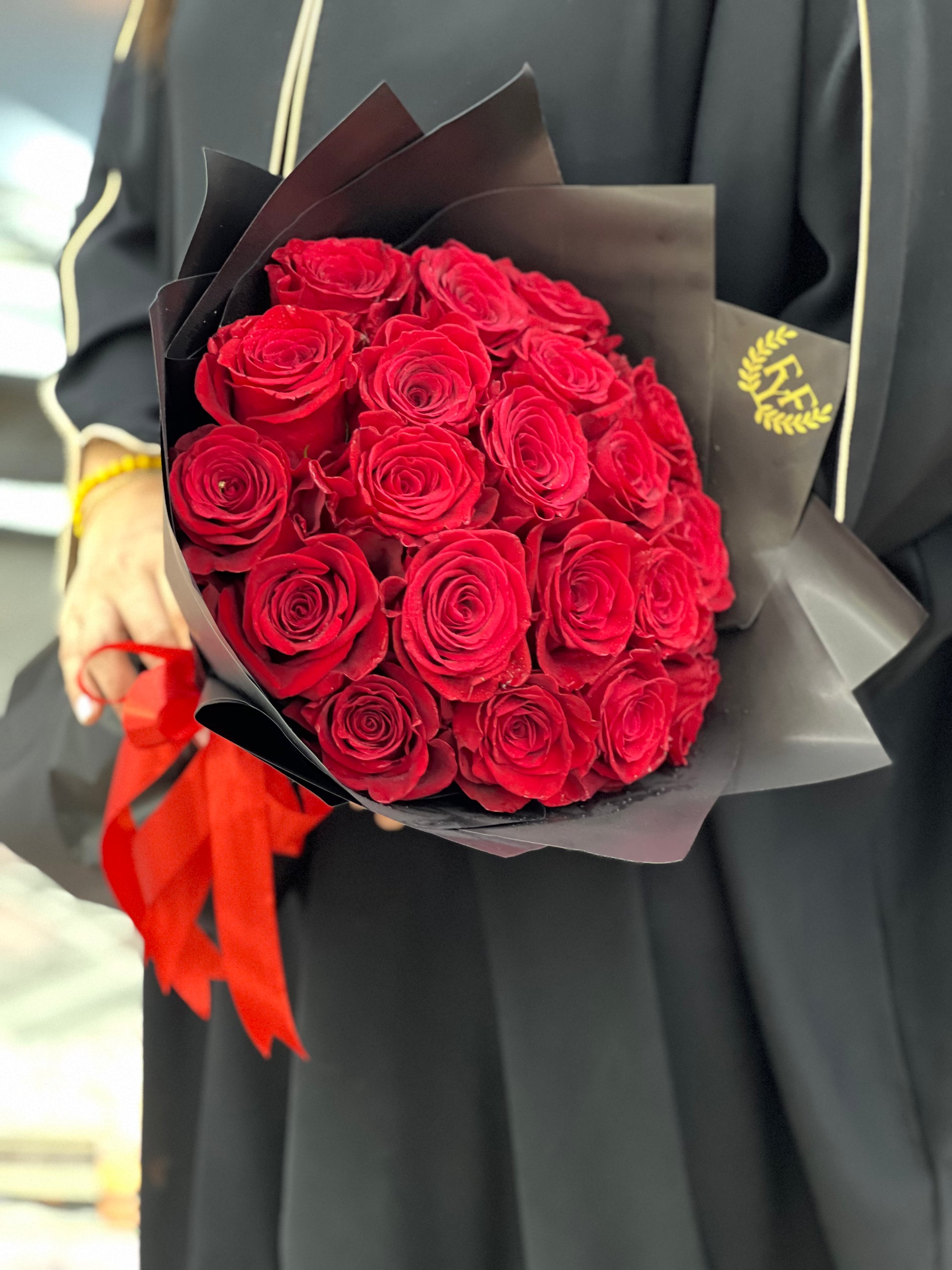 These 20pcs red roses in black flower wrapping with red satin ribbon, the must gift in all occasions.