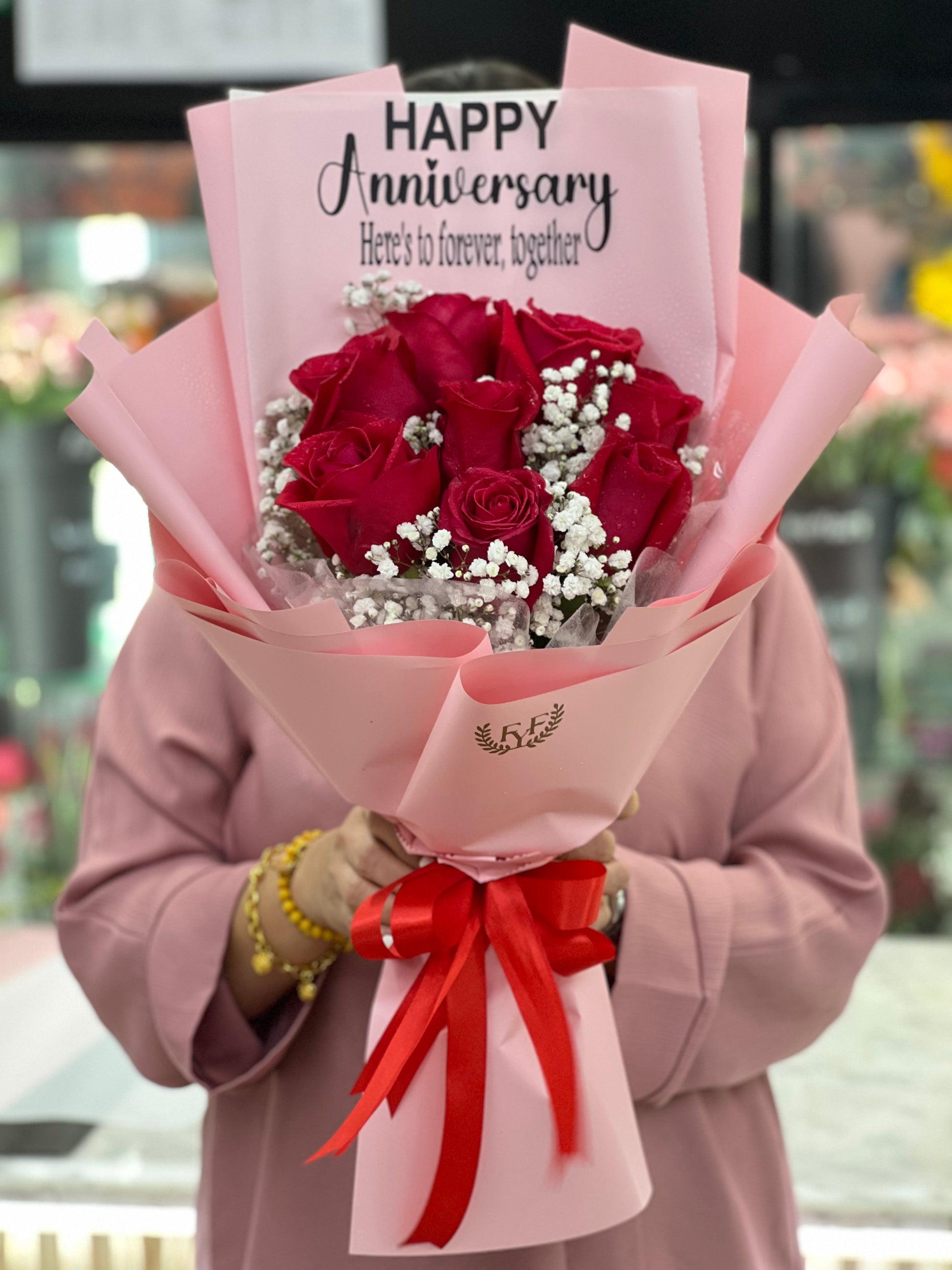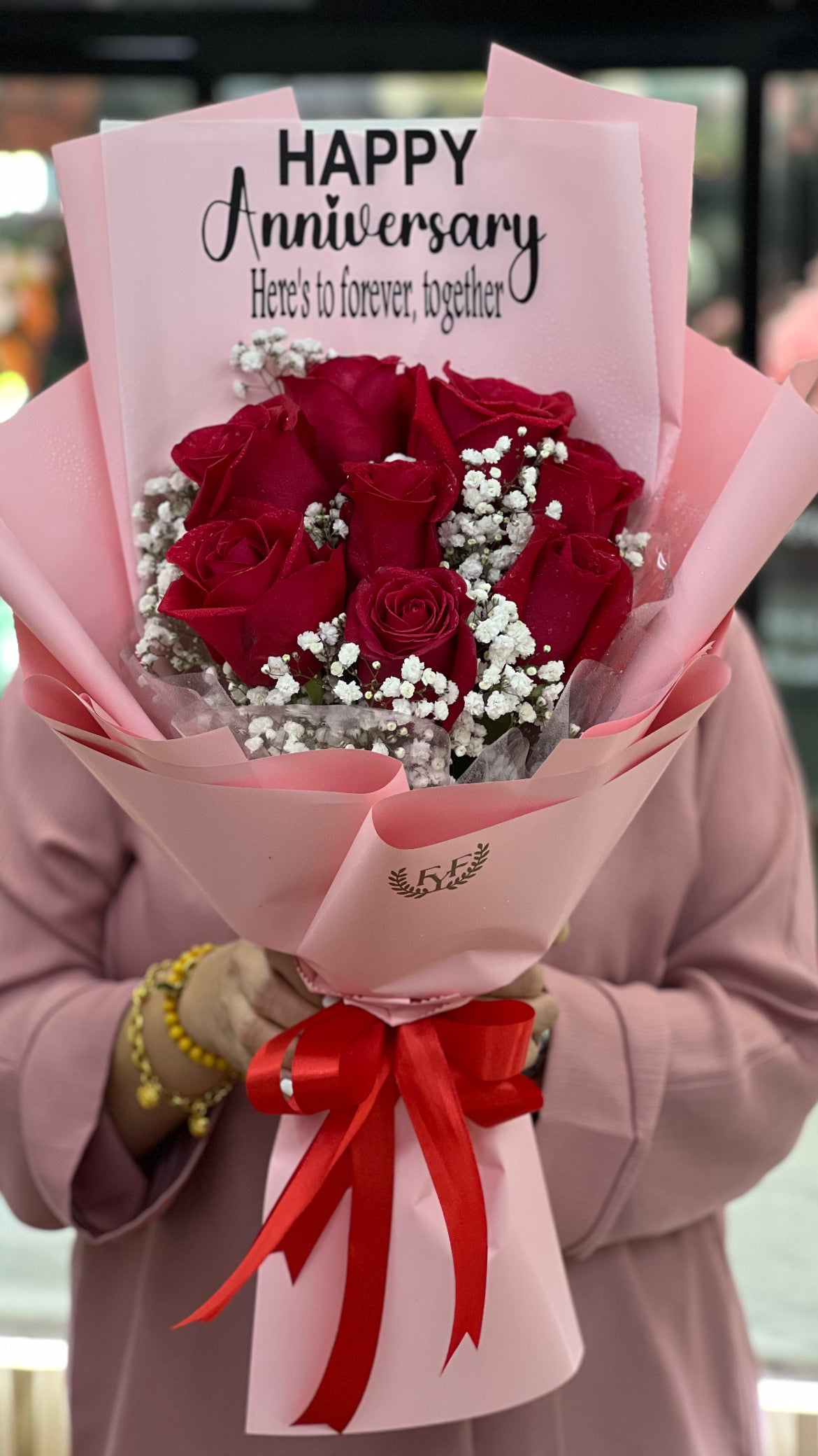 Flowers: 8 fresh red roses — a timeless symbol of love and passion