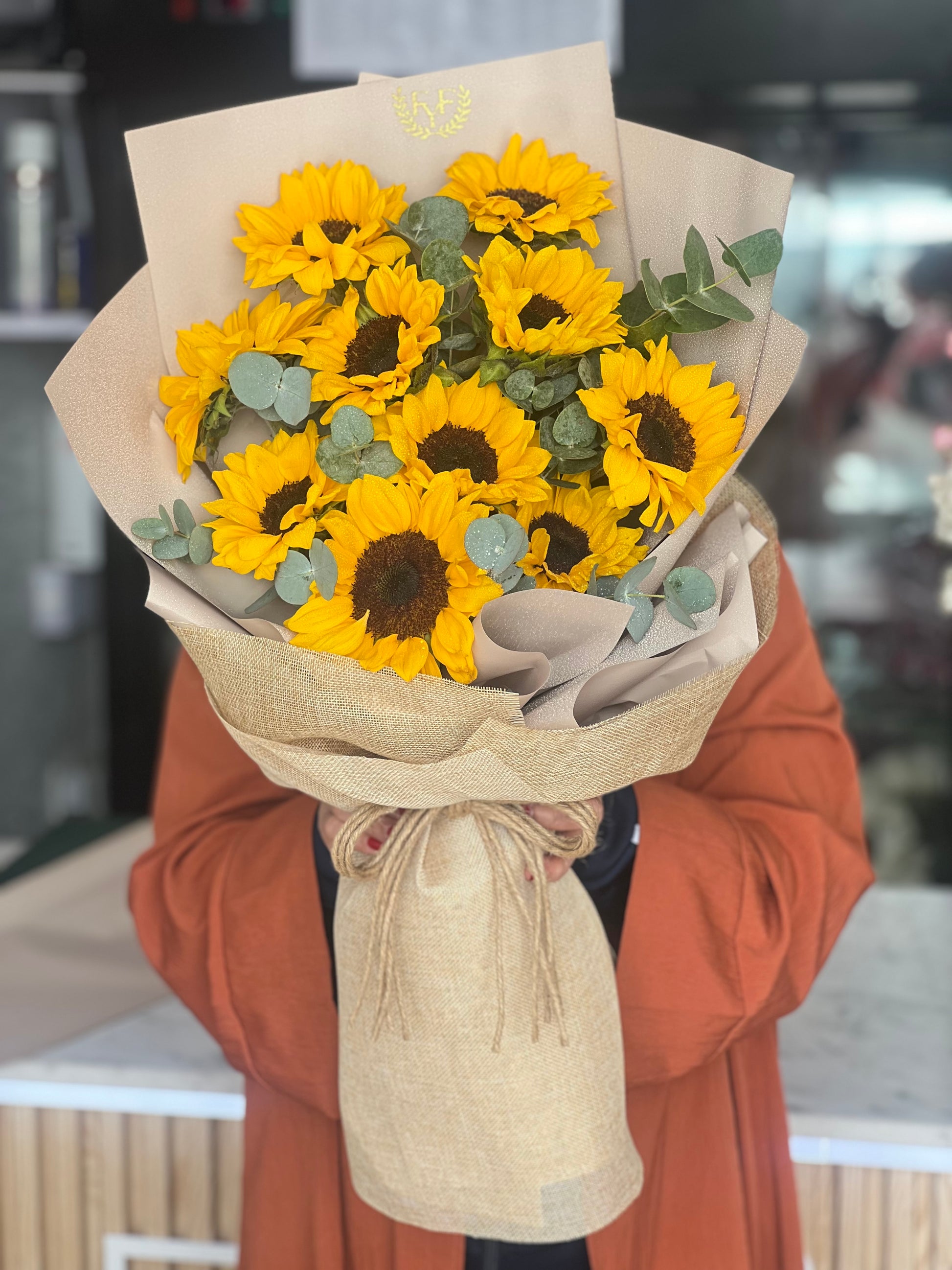 Bright, cheerful, and elegant—this bouquet features 10fresh sunflowers beautifully paired with eucalyptus and wrapped in luxurious brown paper. A perfect gift to express happiness, warmth, and appreciation.