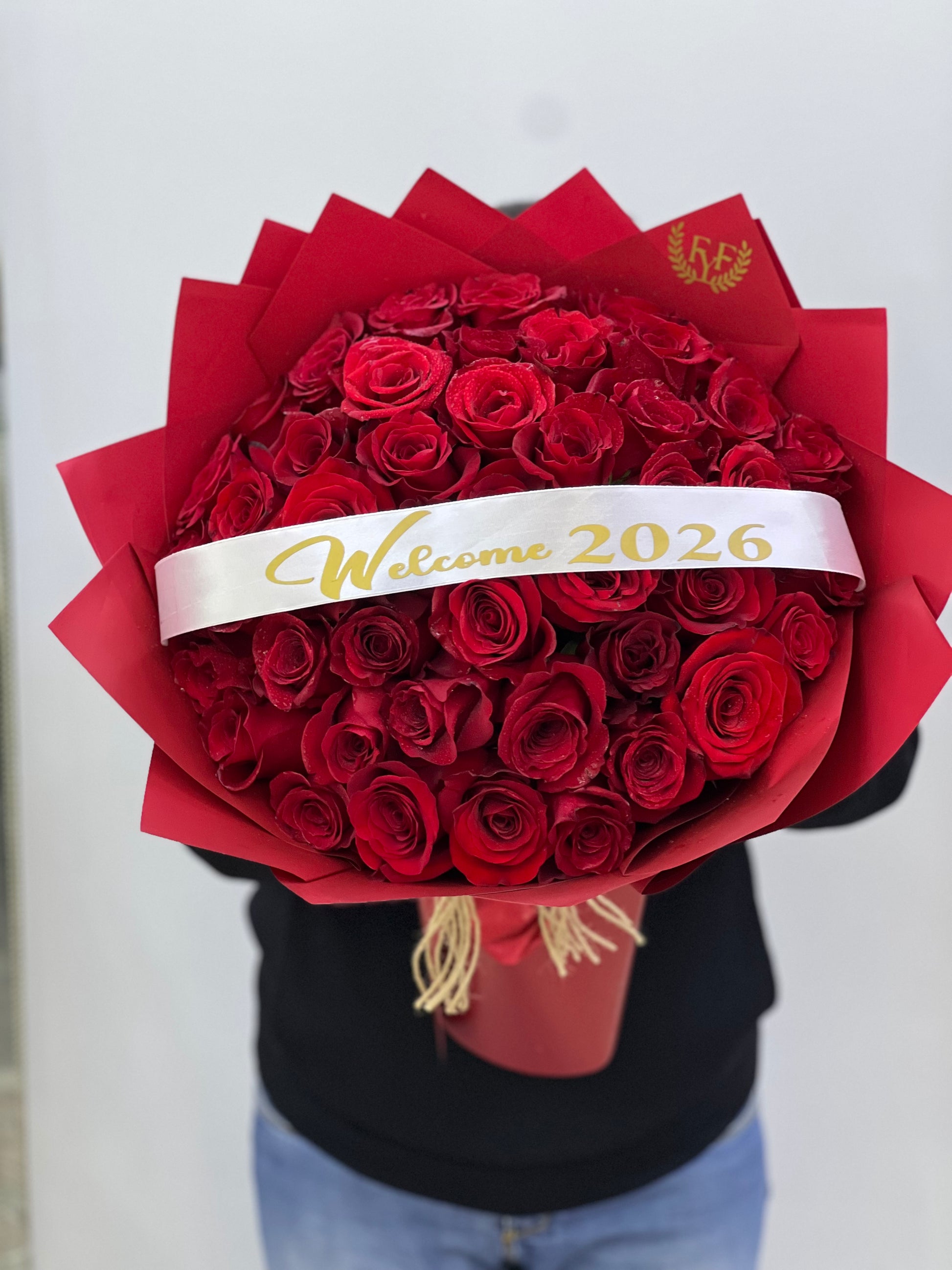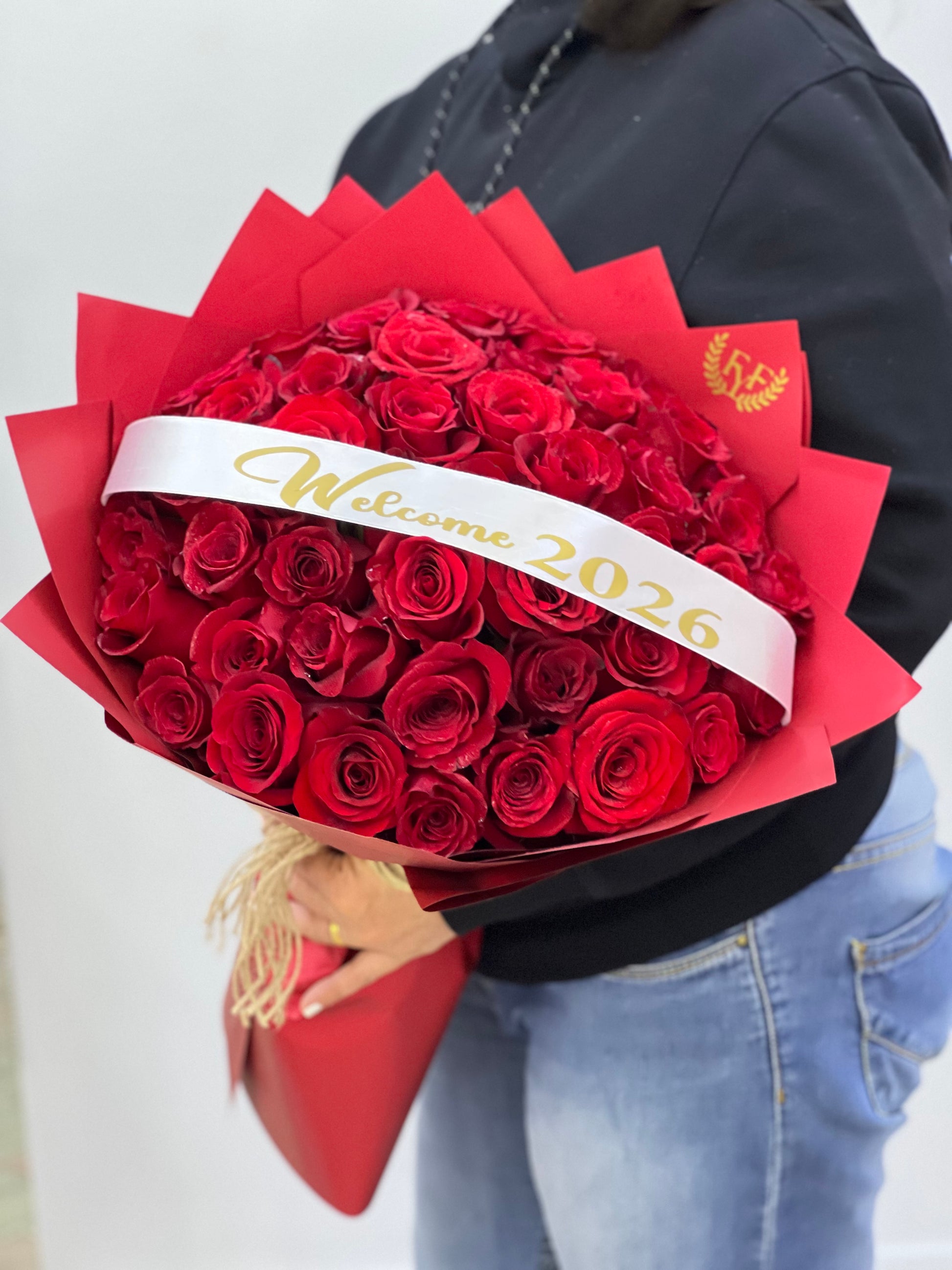 50pcs red Roses in red Wrapping with Welcome 2026print. Fresh flowers for Year