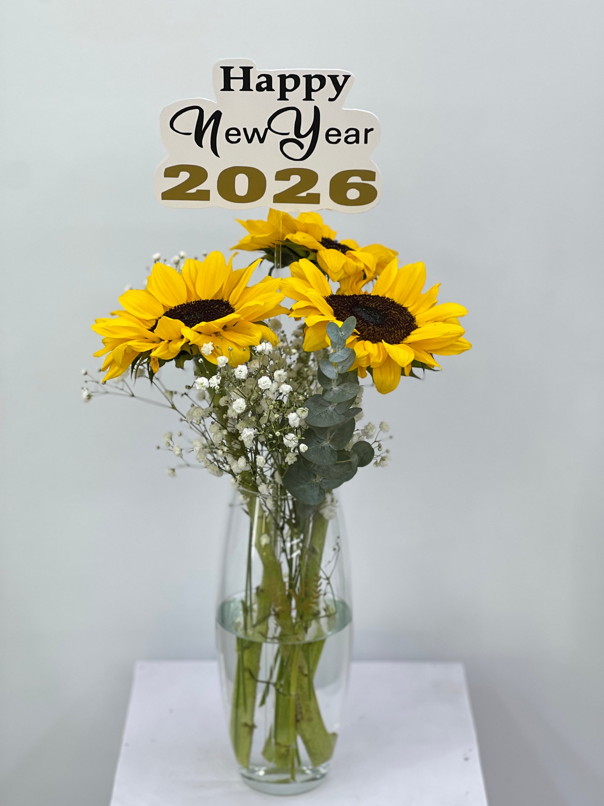 3pcs sunflower with baby’s breath and eucalyptus in 26cm cylinder vase. Best welcoming gift for New year.