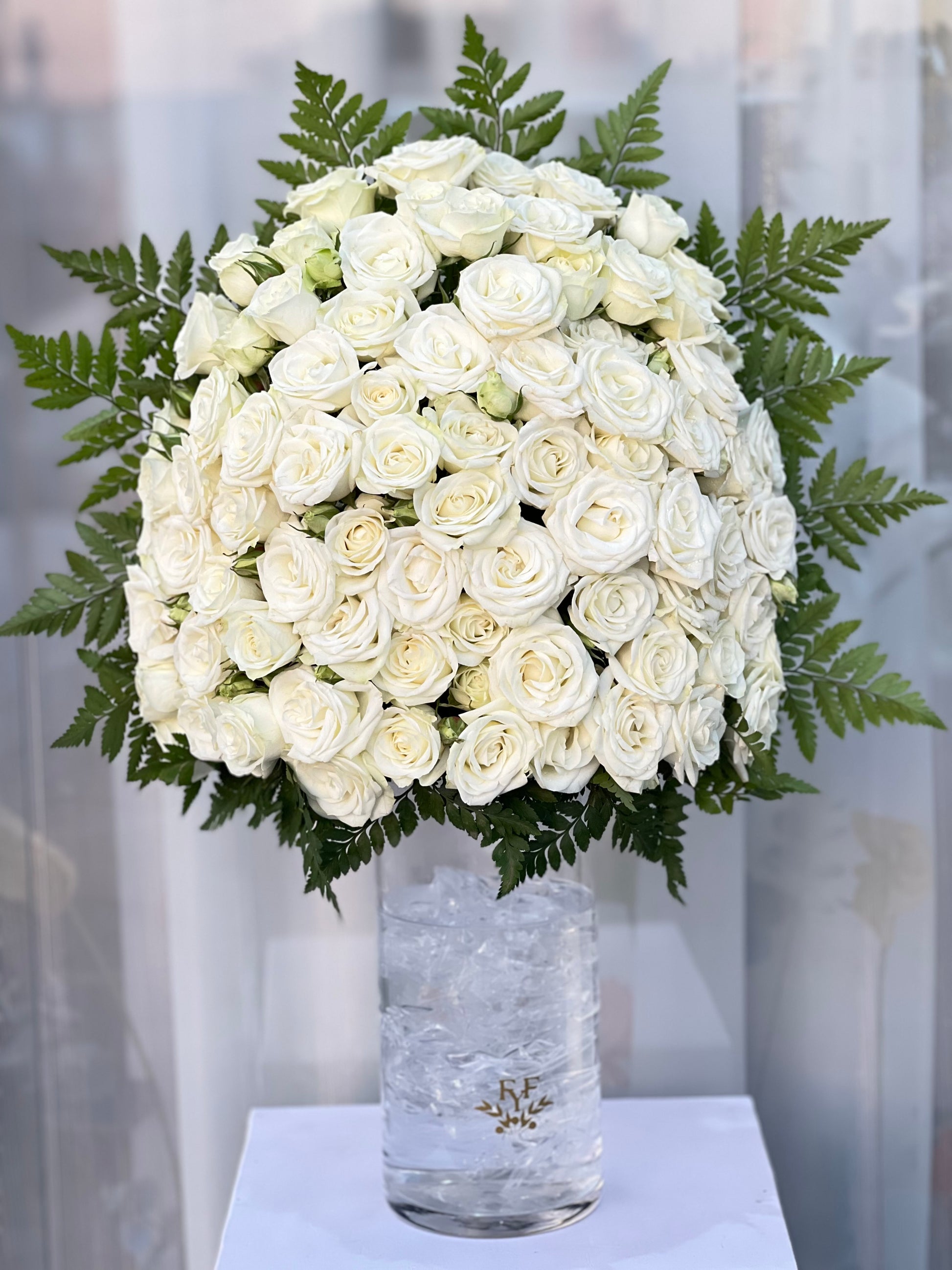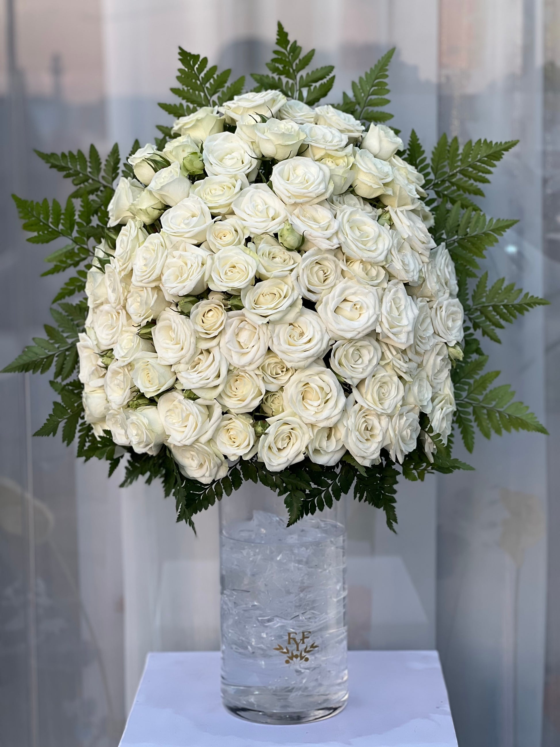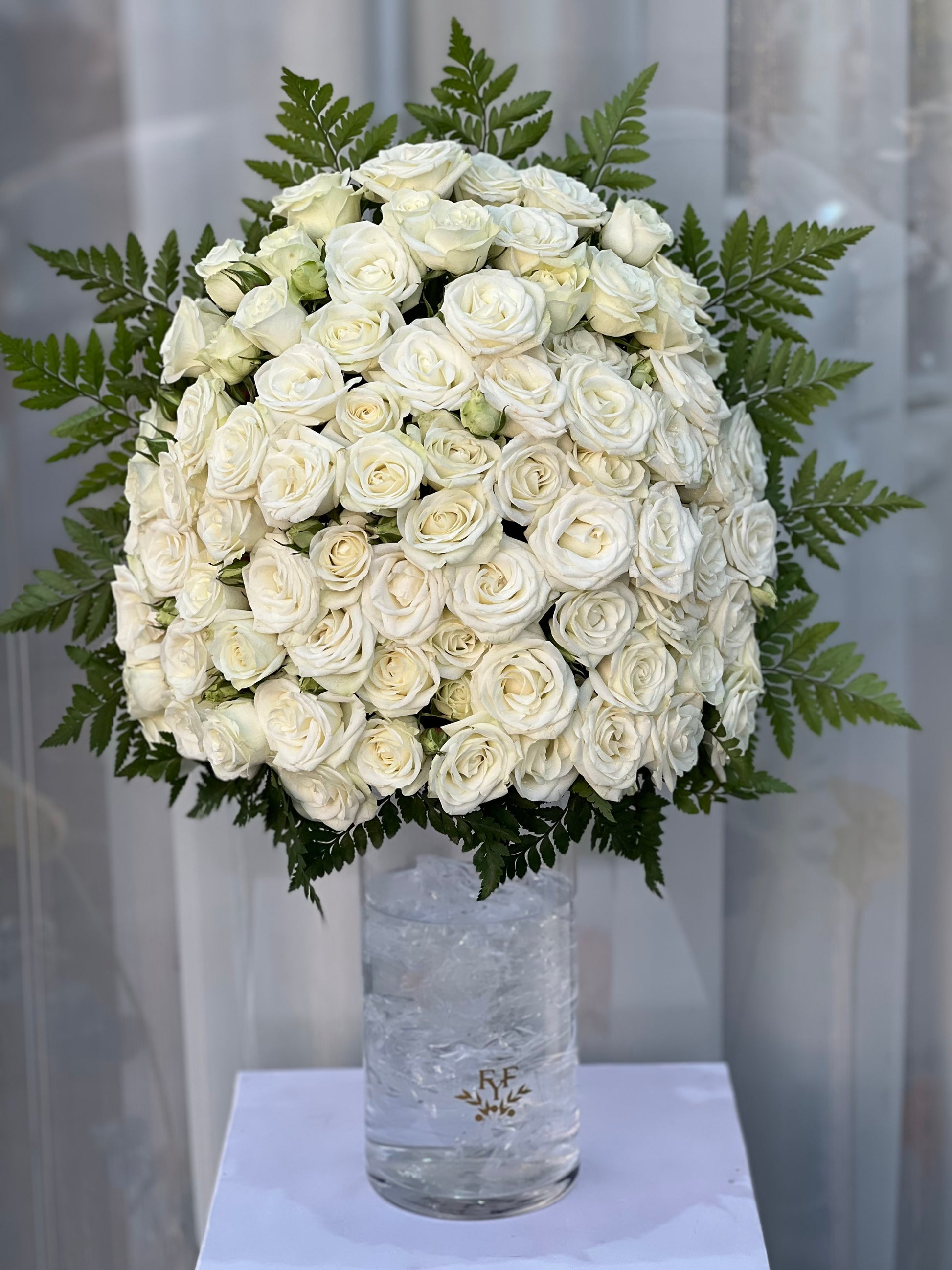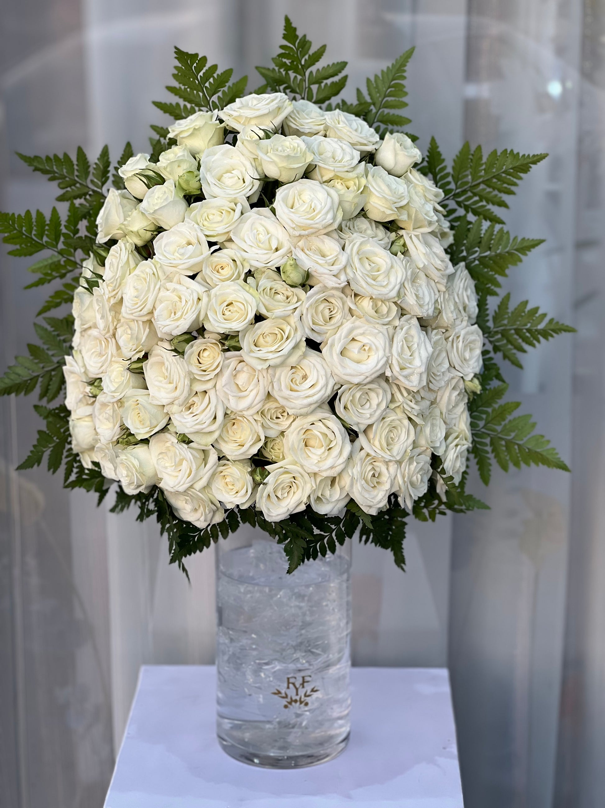 White Baby Roses in cylinder vase
