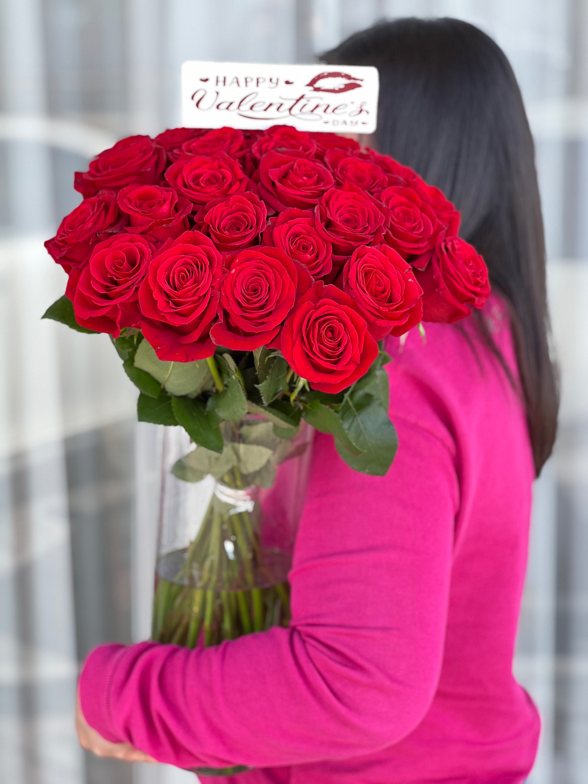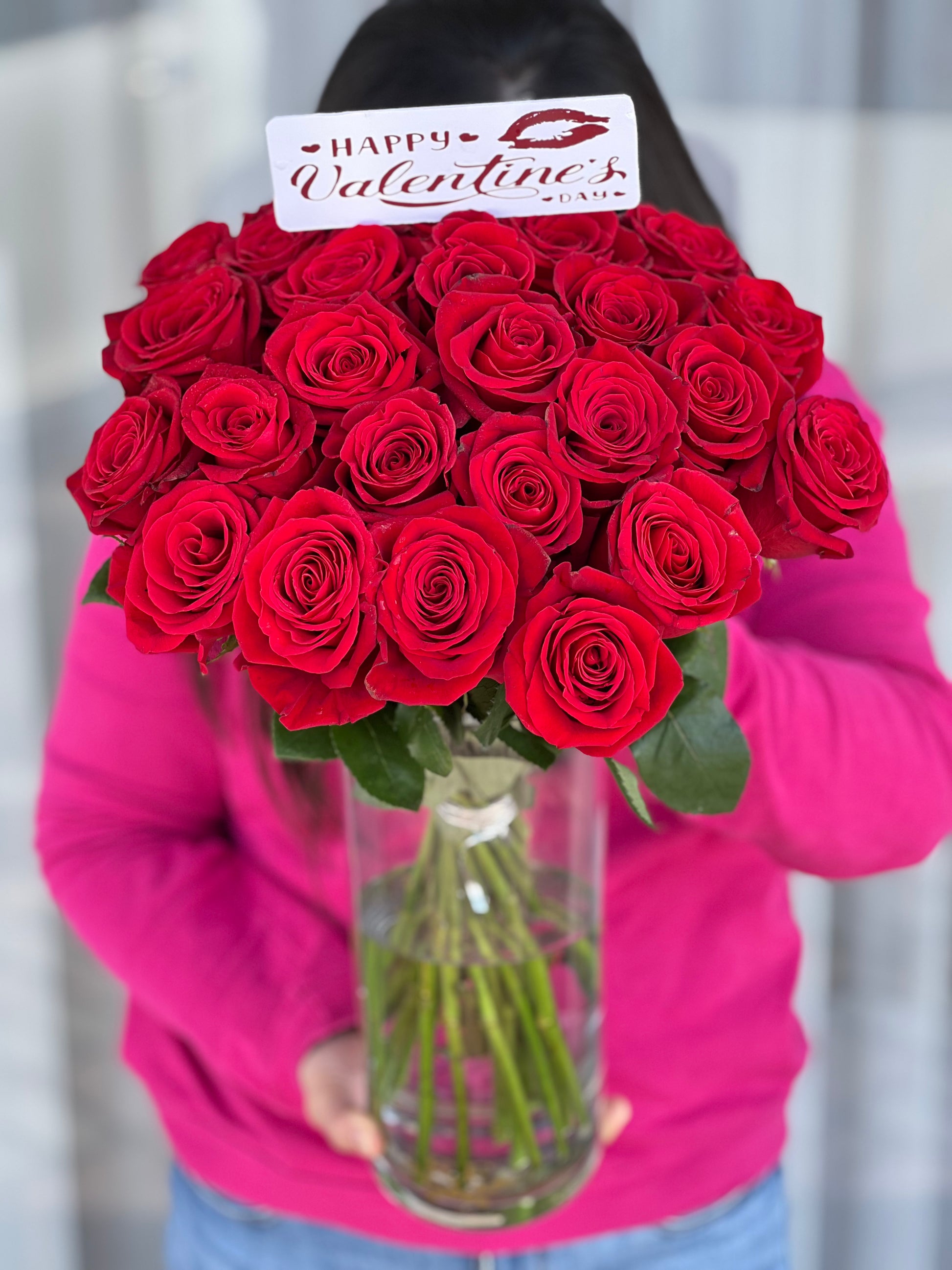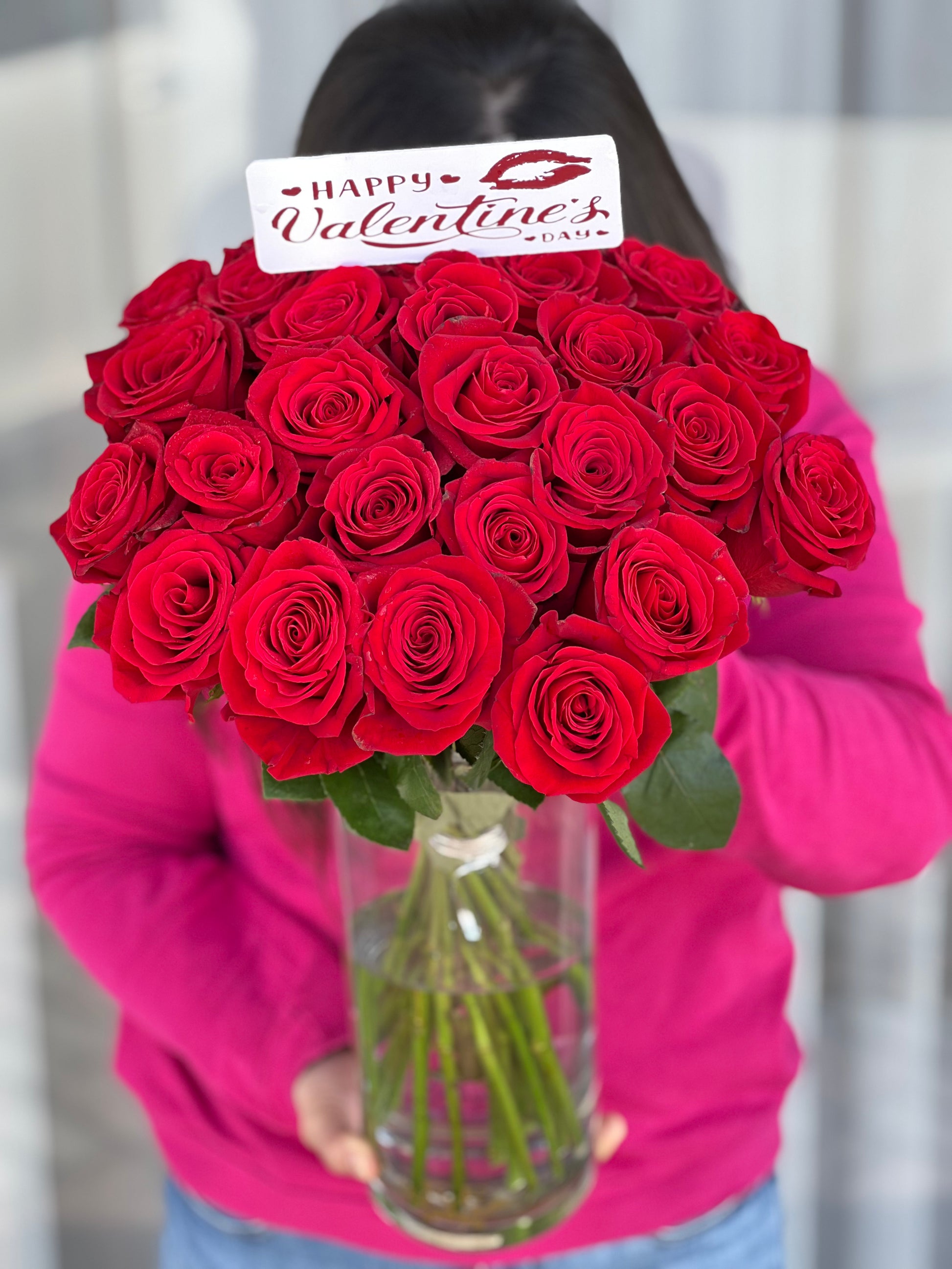 25pcs red roses in cylinder vase with Happy Valentines topper
