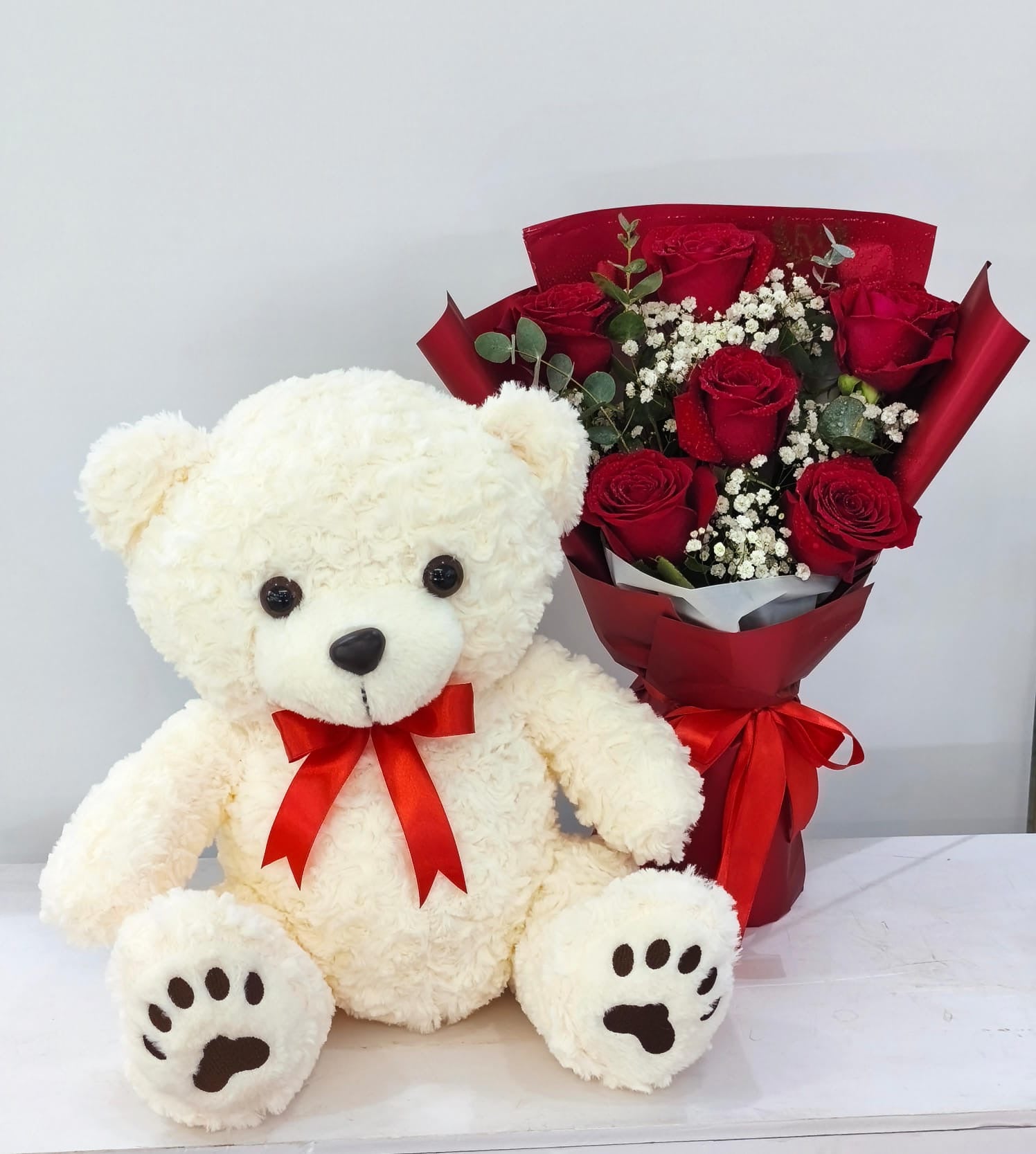 A bundle of small white teddy bear with half dozen red roses bouquet. Love speaks in action. #valentinesbouquet