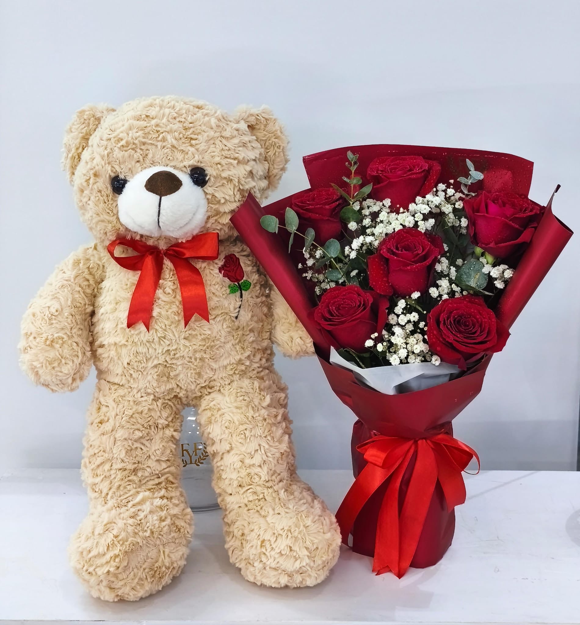 Half dozen red Roses bundle with 45cm sweet teddy bear.